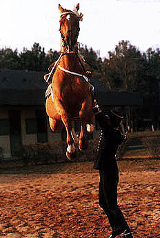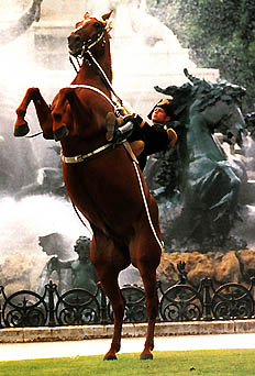 Apparus sous la Renaissance Italienne, les "Sauts d'Ecole" servaient à orner les chorégraphies des carrousels. Ils permettaient de prouver la valeur et la solidité des cavaliers en selle. La courbette et la croupade ont été conservées dans un style propre à Saumur. La cabriole conserve son style classique. C'est au XIXème siècle que "le travail à la main" s'ajoute à l'emploi des piliers pour le dressage des sauteurs. |