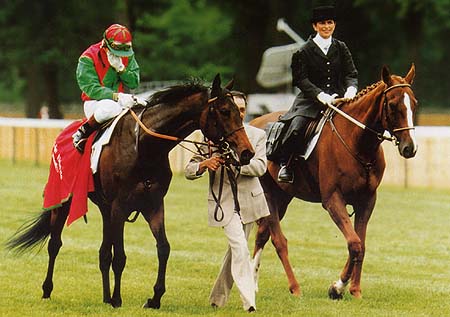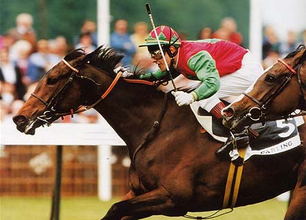 A l'automne, la belle double la mise en démarrant de loin sur les 2400 mètres de l'essentiel Prix Vermeille. Carling est bien la meilleure pouliche de France. Il lui reste désormais à affronter les mâles dans le Prix de l'Arc de Triomphe. Carling "engage" énormément et, de plus a du caractère. Elle n'aime ni être bousculée, ni être gênée. Dans le "Jacques Le Marois", au mois d'août, elle avait été tamponnée et mise hors-course par un adversaire; l'ostéopathe, venu la soigner, lui remit alors une vertèbre. De toute façon, le praticien savait qu'elle avait quelque chose avant même de la toucher, car elle l'accepta chez elle. Si elle n'avait rien eu, elle l'aurait viré du box. Dans l'Arc, Carling devenue la propriété de Monsieur Yoshida allait être mise au chaud par la coalition anglo-maktoumienne. Quand, enfin, elle put voir le jour, Lammtarra était déjà très loin... Après une Japan Cup de fin de saison, où Carling, sans doute fatiguée, ne put montrer son véritable visage, il était décidé que la fille de Corraleja resterait à l'entraînement à quatre ans. Pour le plus grand bonheur de tous ses amoureux. |