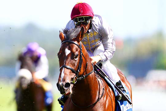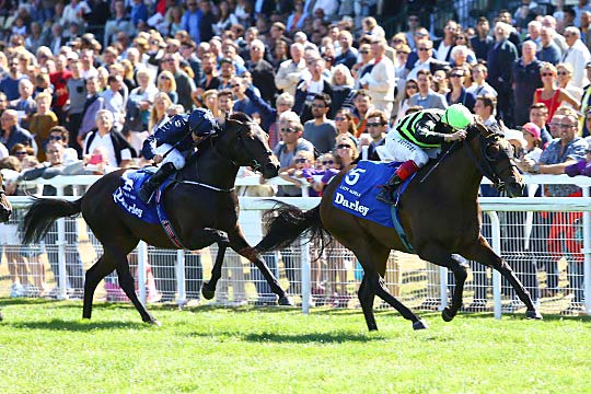 Courte "passe d'armes"... Shalaa prend sûrement le pas sur Gutaifan, permettant à Lanfranco Dettori de conserver son titre.