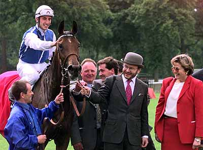 Père des trois premières des Oaks, soit Imagine, Flight Of Fancy et Relish The Thought.Et puis, le lendemain, le samedi 9 juin 2001, Sadler's Wells a conquis la distinction qui lui manquait encore, anachroniquement. D'une foulée sensationnelle, sous la même casaque gros bleu qu'Imagine, au terme de la longue droite d'Epsom, Galileo, son fils avec Urban Sea, la célèbre gagnante de l'Arc, lui a offert le plus beau des rubans bleus, une victoire dans le Derby.