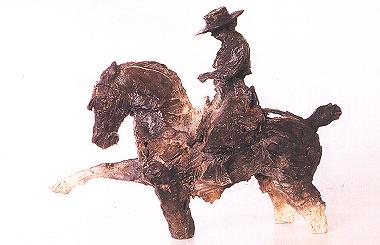 Autour de la carrière, chaque jour, il dessine des amazones, des chevaux ibériques ou américains. Il croque sur le vif des "moules", des tas de dessins qu'il ne retouche jamais. Il saisit à l'encre les mouvements, les expressions, les "gueules" sur tout ce qu'il trouve, papier, carton, kraft... " Me retrouver au coeur de la fête et dessiner sur le vif; c'est ce qui me plaît. Ainsi, ne parlons pas de technique mais plutôt de ressenti, ce que j'appelle moi, l'écriture inconsciente... Si vous voulez, lorsque j'assiste à une corrida, je mime le ballet sur mon papier. Sur le fond, j'aime les choses qui bougent et font bouger". Victor a dessiné son premier cheval à cinq ans sur du ciment frais. Les cow-boys et les indiens des bandes dessinées de son enfance fixent dans son esprit la fusion de l'homme et de sa monture. Aujourd'hui, il puise son inspiration souvent dans le milieu équestre ou celui des corridas. Il traîne ses bottes, muni de son carnet de croquis, dans les fêtes équestres de Provence et dans les arènes de Nîmes et d'Arles. |