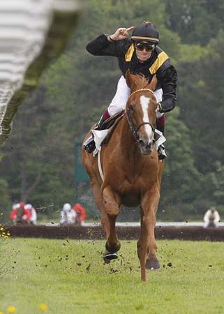 Le protégé de Jean-Paul Gallorini l'emporte de loin - environ deux cent cinquante mètres! - , alezan joyeux, seul au monde. Christophe Soumillon a réussi son improvisé banco. Mandali est devenu hurdler-roi d'Auteuil. En rigolant...