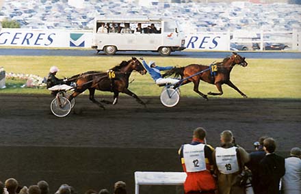 La puissance à l'état pur, l'air de ne pas y toucher! Voilà pourquoi il donne l'impression de voler. Le cheval, sûr de lui, n'a pas besoin d'être commandé.L'homme Jean-Etienne Dubois, sur son sulky, certain de la valeur de son crack, n'agit presque pas. Il l'accompagne, c'est tout. Nous sommes loin de l'errance de The Godolphin Arabian, dans les rues de Paris, quand le petit cheval tirait son tonneau d'arrosage, fouetté méchamment par un bourreau imbécile.