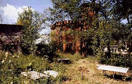 En contournant la bâtisse, on débouche bientôt sur un terrain vague envahi par les herbes folles et les fleurs sauvages, au milieu desquelles on distingue à peine de longues dalles de marbre sur lesquelles on peut déchiffrer des inscriptions gravées dans une belle calligraphie cyrillique. Des pierres tombales, comparables à celles d'un cimetière "humain".